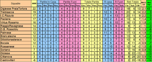 CLASSIFICA Digiesse PraiaTortora 22 Trebisacce 19 I.C.Rizzuto 17 Paolana 17 Virtus Rosarno 16 ReggioRavagnese 14 D.B. Rossoblu 13 Palmese 12 Brancaleone 12 StiloMonasterace 12 Bocale 12 Rossanese 11 Soriano 7 Gioiese 6 Cittanova 3 Castrovillari -6 |