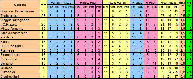 CLASSIFICA Digiesse Praiatortora 26 Trebisacce 25 ReggioRavagnese 20 I.C.Rizzuto 20 Virtus Rosarno 19 StiloMonasterace 18 Paolana 18 Bocale 18 D.B. Rossoblu 16 Palmese 15 Brancaleone 13 Rossanese 11 Soriano 10 Gioiese 4 Cittanova 3 Castrovillari -4 |