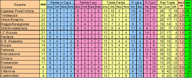 CLASSIFICA Digiesse PraiaTortora 32 Trebisacce 31 Virtus Rosarno 25 ReggioRavagnese 23 StiloMonasterace 22 I.C.Rizzuto 21 Paolana 21 D.B. Rossoblu 19 Bocale 19 Palmese 18 Brancaleone 17 Soriano 16 Rossanese 11 Gioiese 4 Cittanova 3 Castrovillari -4 |