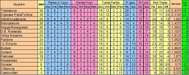 CLASSIFICA Trebisacce 38 Digiesse PraiaTortora 38 StiloMonasterace 29 Brancaleone 26 ReggioRavagnese 26 D.B. Rossoblu 25 Virtus Rosarno 25 Paolana 24 I.C.Rizzuto 23 Bocale 23 Soriano 20 Palmese 19 Rossanese 17 Gioiese 8 Cittanova 4 Castrovillari -1 |