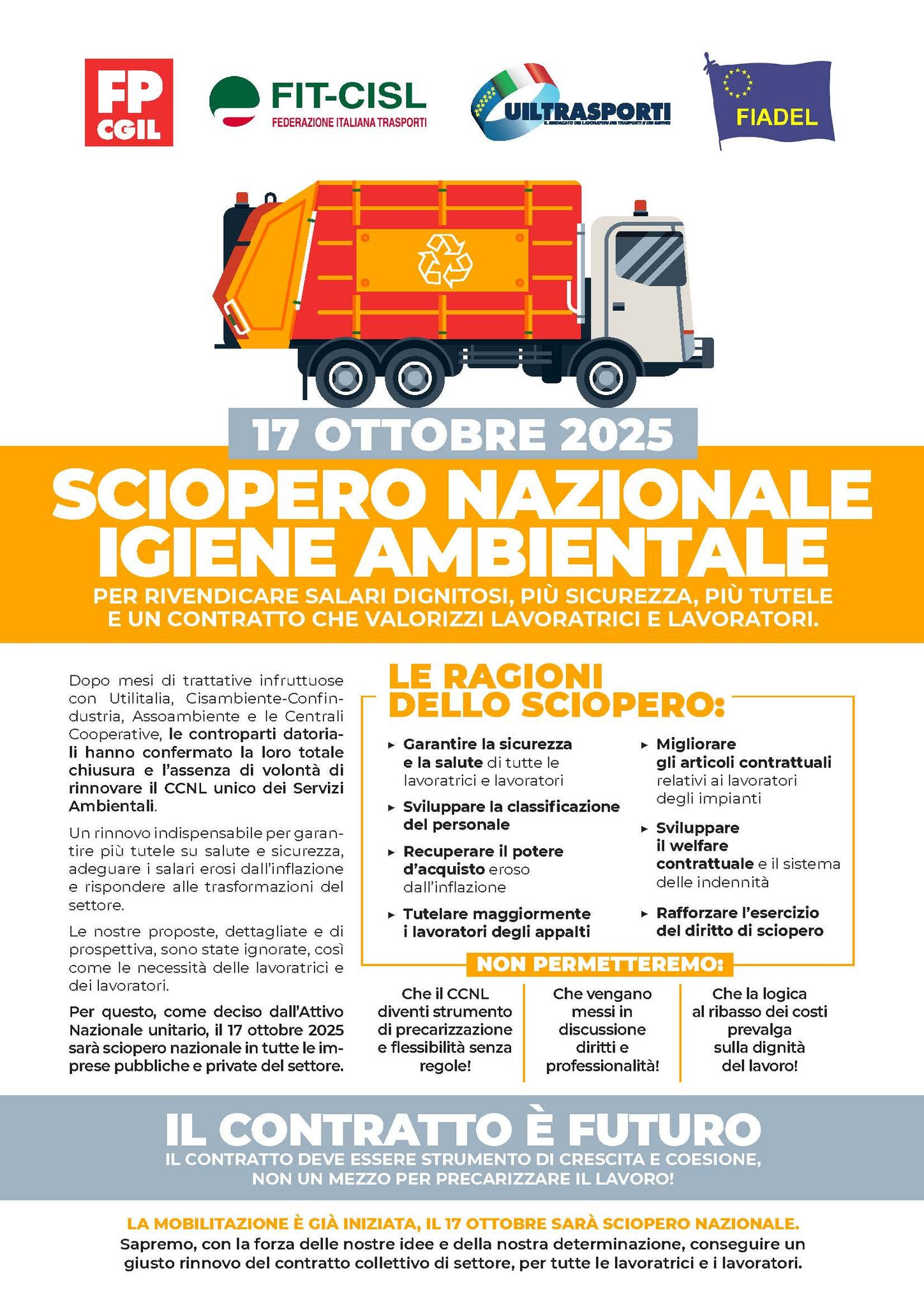 Castrovillari, domani venerdi' 17 ottobre stop alla raccolta differenziata a causa di uno sciopero nazionale - I sindacati FP CGIL FIT-CISL UILTRASPORTI E FIADEL rendono noto che per la giornata di domani venerdi' 17 ottobre 2025 e' stato indetto uno sciopero nazionale degli addetti all' Igiene ambientale. Pertanto si potrebbero verificare disagi sia nella raccolta porta a porta delle utenze domestiche (raccolta carta e cartone) che per la raccolta delle utente non domestiche. Per evitare problemi di decoro si invitano i cittadini a non conferire stasera carta e cartoni. Si ricorda che è sempre possibile portare i rifiuti in maniera autonoma presso l'isola ecologica in località PIP nei giorni successivi. Contestualmente il settore Ambiente del Comune di Castrovillari si scusa per gli eventuali disagi che non sono evidentemente a loro imputabili.