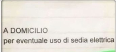 Calabria: " Nel dubbio ( scherzoso ),  gli prescrivono " una valutazione fisioterapica per una sedia elettrica ", il refuso di un medico del cosentino - E' una storia sui generis che suscita semplicemente ironia, quella di vedere prescritta una " valutazione fisioterapica per sedia elettrica ". Ma e' quanto capitato ad un medico del cosentino e di conseguenza al paziente. L' immagine in questione debitamente occultata nei dati sensibili e' diventata virale dopo essere stata pubblicata sui social da una collega del dottore. E' evidente l' errore di battitura o il lapsus freudiano, ma è chiaro che se al posto della visita fisiatrica si fosse trattato di un farmaco mal prescritto l' ironia starebbe a zero.