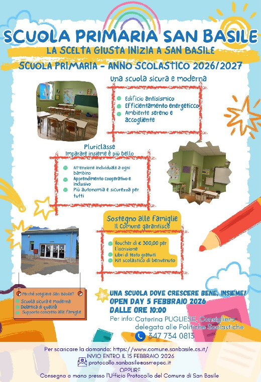 San Basile - Il 5 febbraio Open Day per la Primaria: il Comune garantisce voucher di 300 euro per l' iscrizione. L' istituzione del nuovo ciclo della Scuola Primaria rappresenta un simbolo di resistenza allo spopolamento che sta colpendo le aree interne e i piccoli comuni. La scuola come spazio educativo dove crescere bene insieme, ma soprattutto come presidio educativo, culturale e sociale da non perdere. Per la comunità di San Basile, l’istituzione del nuovo ciclo della Scuola Primaria rappresenta un simbolo di resistenza allo spopolamento che sta colpendo le aree interne e i piccoli comuni. Un bene collettivo da sostenere e promuovere, capace di rafforzare il senso di appartenenza e inclusione. In questa ottica si inserisce l’Open Day rivolto alle famiglie che si apprestano a scegliere l’istituto presso cui iscrivere i propri figli per l’anno scolastico 2026/2027. La data da segnare in calendario è per mercoledì 5 febbraio alle ore 10:00, quando l’Istituto Omnicomprensivo di San Basile aprirà le sue porte alla comunità. La scuola, edificio di nuova concezione, antisismico e dotato di efficientamento energetico, si presenta come un ambiente sereno e accogliente, pensato per favorire l’apprendimento e il benessere degli alunni, con una didattica di qualità e un concreto supporto alle famiglie. Un luogo che dialoga con il territorio e che si inserisce nel più ampio percorso di accoglienza e integrazione promosso anche attraverso il Progetto SAI (Sistema di Accoglienza e Integrazione) attivo a San Basile, rafforzando il ruolo della scuola come spazio di incontro, inclusione e crescita condivisa. A sostegno delle iscrizioni, l’Amministrazione comunale di San Basile ha previsto importanti agevolazioni: un voucher di 300 euro per l’iscrizione, la gratuità dei libri di testo e un kit di benvenuto per gli alunni della Primaria. «La scuola oggi è un pilastro indispensabile per garantire il diritto allo studio e contrastare lo spopolamento che, nei piccoli comuni, rappresenta un’emorragia silenziosa ma evidente, capace di mettere a rischio la stessa esistenza delle istituzioni scolastiche. Per questo l’apertura delle iscrizioni è un appello alle famiglie e un segnale chiaro per l’intera comunità. San Basile – dichiara Caterina Pugliese, consigliera delegata alle Politiche Scolastiche del Comune di San Basile – crede nella scuola e nel suo valore sociale ed educativo. Mantenerla aperta non è solo una questione di numeri, ma una scelta di responsabilità verso il futuro della comunità».