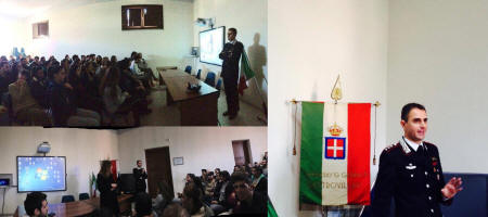 Castrovillari, Liceo classico " G. Garibaldi " - Il capitano dei carabinieri Leotta in visita agli alunni nell' ambito delle giornate dedicate all' ORIENTAMENTO E LEGALITA' - Si e' tenuto oggi ( 4/11/2015 ndr ), nella sala conferenze del Liceo Classico G. Garibaldi l' incontro " Orientamento e Legalita' ", coordinato dalla prof.ssa Katia Tinari, al quale e' intervenuto il capitano della Compagnia dei Carabinieri di Castrovillari, Antonio Leotta. Durante l'incontro il Capitano ha ricordato ai ragazzi delle classi terminali partecipanti ( III A, III B del Liceo Classico e le classi terminali del Liceo Artistico " Alfano " ), l' importanza della giornata del 4 novembre per le Forze Armate. Leotta ha poi descritto, attraverso un istruttivo video, le componenti delle Forze Armate italiane ed i loro compiti (Esercito italiano, Marina Militare, Aeronautica Militare, Arma dei Carabinieri, Guardia di Finanza e corpi ausiliari). Immediatamente dopo la visione del video il capitano ha risposto in modo preciso alle domande poste dagli alunni ed ha sottolineato la pericolosita' dell'uso di alcool e sostanze stupefacenti in particolare modo durante la guida. |
