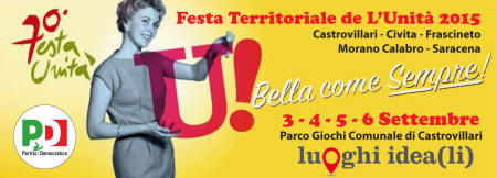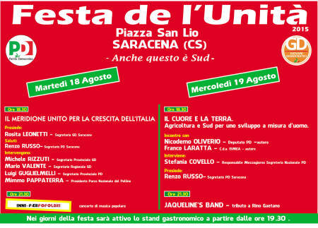 Ritorna anche quest' anno la " Festa de l' Unita' " a Saracena, il 18 e 19 agosto. Il gruppo dirigente e gli iscritti del Partito Democratico e dei Giovani Democratici cittadini hanno deciso di non rinunciare a quest' importante momento di riflessione politica e di aggregazione sociale. Vari dibattiti sul ruolo del Meridione nell' Italia di oggi faranno da sfondo alla due giorni democratica. L' evento si svolgera' il 18 e il 19 Agosto nella centralissima e bellissima Piazza S. Lio. Martedì 18 si partirà con un convegno su “IL MERIDIONE UNITO PER LA CRESCITA DELL'ITALIA” , nel quale interverranno Renzo Russo , segretario della locale sezione del PD e membro dell’Assemblea Nazionale del Partito Democratico; Rosita Leonetti, segretaria GD Saracena e dirigente regionale del PD; Luigi Guglielmelli, segretario provinciale PD; Michele Rizzuti, segretario provinciale GD; Mario Valente, segretario regionale GD e Mimmo Pappaterra, Presidente del Parco Nazionale del Pollino. La serata del 18 sarà allietata dalla musica degli “Inni Pierpolari” . Mercoledì 19 si parlerà di “ Agricoltura e Sud per uno sviluppo a misura d’uomo” con l’importante contributo dell’ on. Nicodemo Oliverio , deputato e autore del libro “Il Cuore e la Terra”; dell’on. Franco Laratta, cda Ismea e autore del libro “Il Cuore e la Terra”;concluderà i lavori l’ on. Stefania Covello, responsabile Mezzogiorno e Fondi Europei nella Segreteria Nazionale del Partito Democratico. A seguire, chiusura della festa con lo spettacolo musicale della “JACQUELINE’S Band – Tributo a Rino Gaetano “.