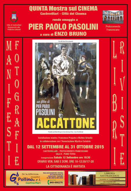 Quinta mostra sul cinema. Omaggio a Pier Paolo Pasolini - Dal 12 settembre al 31 ottobre 2015 il Protoconvento francescano ospitera' la mostra documentaria su Pier Paolo Pasolini. Curata da Enzo Bruno, con la collaborazione dell' associazione culturale Mystica Calabria, la mostra e' stata patrocinata dall'Amministrazione Comunale della città di Castrovillari e dall' assessorato alle Politiche Culturali, per ricordare la complessa figura dell' intellettuale ed artista Pier Paolo Pasolini. La mostra si compone di un ampio e ricco apparato documentario e iconografico per celebrare la figura del grande interprete della città di Roma, scenario cinematografico dei sottoproletari delle borgate, e del cinema italiano, autore di romanzi e film, dal linguaggio rivoluzionario che ha sconvolto il panorama della nostra cultura. Morto tragicamente quaranta anni, Pasolini, poeta, scrittore e regista italiano, considerato uno dei maggiori esponenti della cultura del XX secolo è stato definito «provocatorio, sempre in contrasto con la chiusura ipocrita della mentalità benpensante», e i suoi personaggi «indimenticabili», da “Accattone” a “Mamma Roma” al Cristo, capolavoro nel racconto evangelico di Matteo, solo per citarne alcuni. La mostra, concettualmente suddivisa nelle sezioni letteraria, fotografica e cinematografica, è allestita da Francesco Propato e Matteo Grisolia e si inserisce all'interno del progetto Spazi Storici - Spazi d'Arte che l’associazione sta portando avanti per la valorizzazione e la promozione della cultura nei luoghi storici della città.