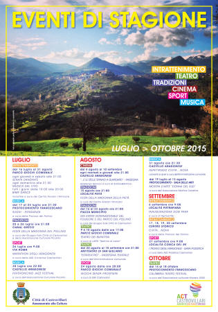 Castrovillari, estate 2015, gli eventi previsti - Il Comune del capoluogo del Pollino lancia gli Eventi di Stagione grazie ad un proficuo e sinergico gioco di squadra tra tutti i componenti dell' Amministrazione e con l' apporto di piu' associazioni per far vivere e godere appieno la citta' di Castrovillari ed il suo patrimonio. " Lo fa -spiegano gli amministratori ed i tanti collaboratori che vi hanno profuso impegno e passione a titolo gratuito - proponendo una serie di appuntamenti che si protraranno sino al 18 ottobre tra intrattenimento, teatro, tradizioni, cinema, sport e musica, coinvolgendo capacità, sensibilità, talenti, espressività desiderio di partecipare ed aprendo, così, il maggior numero di spazi ai protagonisti dell' attività artistica e ricreativa dove ciascuno si pone con la propria originalità." Tutti gli appuntamenti sposano il bisogno sempre più diffuso fra la gente di ritornare alla fisicità e gioiosità di una vita di relazione che questi istanti favoriscono interessando, nello specifico, i vari ambienti della città: il Parco Giochi, il Protoconvento, il Canal Greco, via Roma, il Castello Aragonese, località Pietà, piazza Municipio, Pietrapiana, il rione Civita, Conca del Re, l’Anfiteatro di San Giuliano; luoghi dove gli eventi programmati faranno da riferimento e sintesi per residenti e turisti in cerca anche di opportunità che leghino la storia dei posti al relax.