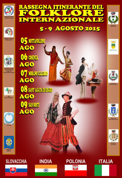 Rassegna Itinerante del Folklore Internazionale dal 5 al 9 di Agosto 2015 - Si terra' dal 5 al 9 agosto la Rassegna Itinerante del Folklore Internazionale organizzata dalla Compagnia Folklorica Provinciale " Calabria Citra ", di Morano Calabro, in collaborazione con la Compagnia " A Pacchianeddra Sansustisa " di San Sosti e con il patrocinio dei Comuni ospitanti, della Regione Calabria, del Parco Nazionale del Pollino e della FITP ( Federazione Italiana Tradizioni Popolari ). Una formula itinerante tra i Comuni del Parco Nazionale del Pollino e quelli del Parco Nazionale della Sila: il 5 a Mottafollone, il 6 a Cosenza, il 7 a Morano Calabro, l’8 a Sant' Agata d’Esaro e il 9 a chiudere nello splendido scenario del Santuario della Madonna del Pettoruto a San Sosti. Oltre ai gruppi dei paesi ospitanti, saranno presenti: il Gruppo Folklorico “ Sarisan” proveniente dalla Slovacchia, il Gruppo di Arte Folklorica “Darshali” proveniente dall' India, il Gruppo Folklorico “ Zawiercie” proveniente dalla Polonia. Ai gruppi internazionali si affiancheranno a rappresentare l’Italia anche il Gruppo Folklorico “ Pastoia del Borgo Furo”, proveniente da Treviso che per l' occasione si gemellerà con la “Pacchianeddra Sansustisa” evento previsto nella mattinata del 9 agosto a San Sosti e il Gruppo Folklorico “ Pro Loco di Castrovillari”. Presenterà, Carlo Catucci, le cinque serate, programmate nei dettagli dal direttore artistico Luigi Stabile e dai presidenti delle compagnie organizzatrici, Chiappetta e Ranuio.
