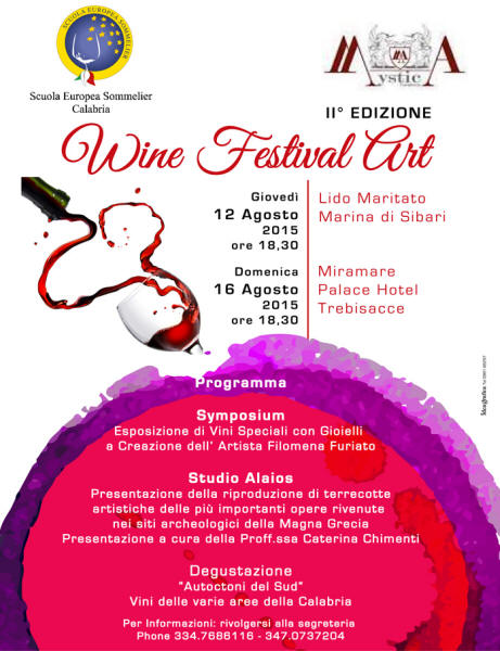 Anche quest' anno ritorna il Wine Festival Art. Dopo il grande successo della prima edizione tenutasi a Castrovillari, la scuola Europea Sommelier Calabria e l' associazione culturale Mystica Calabria ripropongono il Festival del Vino nell' arte e dell' arte del Vino con due date diverse e due diverse location gravitanti, e non poteva essere diversamente, nella rigogliosa Sibaritide: il 12 agosto al Lido Maritato presso Marina di Sibari e il 16 agosto al Miramare Palace Hotel presso Trebisacce. Quest' anno l’iniziativa, curata sempre dal Wine Consulting Franco Pingitore con la collaborazione della prof.ssa Ines Ferrante, presidente di Mystica Calabria che da tempo è impegnata nel promuovere e valorizzare la cultura calabrese, è dedicata al Symposium antico e a quella Sibari che la tradizione mostra come la città del lusso e della mollezza, dell’eccesso e della smodatezza, dei desideri e dei piaceri tra cui, appunto, quello del vino e del convito. La II^ edizione del Wine Festival Art prevede un'esposizione “artistica” di bottiglie di vino eccellente con gli splendidi gioielli interamente realizzati a mano della creatrice castrovillarese Filomena Furiato e le magnifiche riproduzioni di ceramiche magno greche realizzate dallo "Studio Alaios" di Cirò Marina e presentate dalla prof.ssa Caterina Chimenti. Per ogni evento seguirà la degustazione di "Autoctoni del Sud", i migliori vini provenienti dalle varie aree della Calabria. La vitalità della bevanda più apprezzata al mondo, il suo inebriante profumo, la magia dei suoi colori, le incredibili sensazioni che suscita nell'anima di ogni uomo diventano Arte, Storia e Cultura. Ass. Cult. Mystica Calabria
