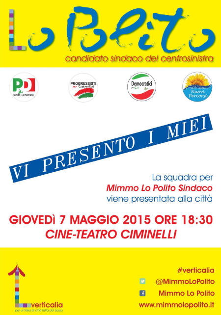 Castrovillari elezioni comunali – Giovedi' 7 maggio, alle ore 18:30, presso il Cinema Teatro " Ciminelli " di Castrovillari, la coalizione di centrosinistra formata da Partito democratico, Partito socialista italiano, Sinistra ecologia e liberta', Progressisti per Castrovillari, Democratici per CV e Nuovi Percorsi presentera' ufficialmente alla citta' le quattro liste che sostengono la candidatura di Mimmo Lo Polito a sindaco di Castrovillari. I nomi delle quattro liste sono: Partito Democratico, Progressisti per Castrovillari, Democratici per Cv e Nuovi Percorsi. |