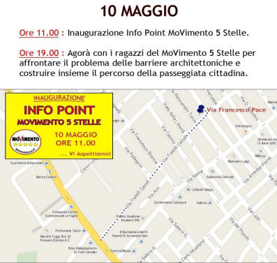 CASTROVILLARI ELEZIONI COMUNALI MAGGIO 2015. COMUNICATO - APRE L'INFO-POINT DEL MOVIMENTO 5 STELLE A CASTROVILLARI - Finalmente apre l' Info Point del Movimento 5 Stelle di Castrovillari, dove i cittadini potranno ricevere tutte le informazioni di cui necessitano. Il punto, ( ex Mulino Vizzi ) e' un locale concesso gratuitamente da Francesco Filomia ( candidato al Consiglio comunale per il Movimento 5 Stelle ) visto la completa assenza di finanziamenti, si trova esattamente all' incrocio tra Via Fratelli Cairoli e Via Francesco Pace in pieno centro a Castrovillari. Alle ore 11 di domenica 10 maggio aprira' al pubblico con la sua inaugurazione. A seguire, la sera, alle ore 19, ci sara' in Via Roma l' Agora' di inizio manifestazione contro le barriere architettoniche prevista per lo scorso 26 aprile ma che non è stata possibile realizzare per via dell'inizio delle raccolte firme. Con l'occasione ci sarà l'opportunità di conoscere i candidati della lista Movimento 5 Stelle. Movimento 5 Stelle Castrovillari |