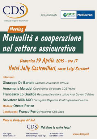 COMUNICATO STAMPA – Sta nascendo la prima compagnia di assicurazioni del Sud Italia. Primo convegno a Castrovillari della CdS. Domenica 19 aprile 2015, alle ore 17:00, presso la sala convegni del Jolly Hotel di CASTROVILLARI, si terra' il primo convegno, dal titolo " Mutualita' e cooperazione nel settore assicurativo ", della costituenda Compagnia del Sud Societa' cooperativa per Azioni ( CdS SCpA ) col patrocinio della Banca di Credito cooperativo " Mediocrati ". Interverranno: Giuseppe De Bartolo ( Docente universitario dell' UNICAL ); Annamaria MARADEI ( Coordinatrice del gruppo CDS Pollino ); Francesco LO GIUDICE ( Responsabile del settore cultura dell' ANCI Giovani Calabria ); Salvatore MONACO ( Consigliere regionale della Confcooperative Calabria ). Modera: Oreste PARISE. Conclude: Franco FERRO ( Presidente della CdS ScpA ). Tema dell'incontro sarà la presentazione della nuova realtà che si prefigge i seguenti obiettivi: 1. ridurre i costi assicurativi con un piccolissimo e unico investimento; 2. ottenere le giuste tariffe per le famiglie e per le imprese residenti nel Sud Italia che oggi sono mediamente più alte del 30-50% rispetto a quelle applicate nel resto d’Italia; 3. creare nuovi posti di lavoro per i giovani del Sud; 4. pagare i premi delle nostre innumerevoli polizze assicurative alla prima ed unica Compagnia del Sud; 5. lasciare la ricchezza economica sul territorio meridionale. La CdS, col motto “Noi siamo la nostra forza!”, si vuole proporre come realtà nuova e alternativa nel panorama assicurativo. Come si evince dalle informazioni sul suo conto, infatti, «sarà la prima compagnia di assicurazioni con sede operativa nel Mezzogiorno e una delle poche imprese assicuratrici in forma cooperativa del nostro Paese». Costituirà «una novità assoluta per il comparto assicurativo», ovvero «un progetto particolarmente importante per il nostro territorio e per l’intero Meridione», la cui «sfida consiste nel dimostrare che esiste un Sud operoso e solidale che sa creare autonomamente sviluppo e occupazione attraverso un'imprenditoria sana, etica e mutualistica»; un sogno da condividere «con tanti meridionali che possano aderire al progetto e costruire un azionariato diffuso e democratico per la Compagnia», grazie all'«esperienza e capacità maturate in tanti anni di lavoro nel comparto assicurativo» e al «sostegno di due Banche e di centinaia di Soci che hanno già aderito alla Società», a cui «è necessaria l'aggiunta della partecipazione, competenza, passione ed [...] entusiasmo» dei cittadini «per essere protagonisti di un grande progetto di sviluppo del nostro territorio», per far sì che il «fiume di denaro raccolto» su di esso, e «trasferito quotidianamente al Nord o all’estero», possa poter essere intercettato da una realtà più vicina a coloro che lo producono. Per fare un esempio, infatti, «nel 2013 la raccolta dei premi assicurativi nelle regioni meridionali, dove non esistono sedi legali od operative di compagnie di assicurazioni, è stata pari a 24 miliardi di euro». |