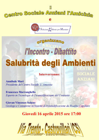 CASTROVILLARI, PRESSO IL CENTRO SOCIALE L' AMICIZIA INCONTRO OGGI SULLA SALUBRITA' DEGLI AMBIENTI - Castrovillari - Si terra' oggi ( giovedi' 16 aprile ) alle ore 17 presso la sede del centro sociale L' Amicizia l' incontro-dibattito sulla salubrita' degli ambienti. L' incontro mettera' a nudo le problematiche della salubrita' degli ambienti, facendo focus sull' umidita' da risalita capillare e da condensa, ne saranno analizzati gli aspetti, le cause, le soluzioni. Il taglio non sara' solo specifico, ma e' previsto anche un intervento da parte di un legale che si soffermera' sulle responsabilita' di chi vende o fitta l' immobile e delle opportunita' che gli acquirenti o gli inquilini hanno a loro disposizione per far valere i propri diritti. L' evento si chiudera' con l' intervento di un medico che si soffermera' sull' aspetto clinico del problema. Interverranno inoltre il presidente del centro anziani L' Amicizia, Annibale Mari, Francesco Marranghello esperto in Tecnologie di Deumidificazione del Costruito e Giovan Vincenzo Solano geologo e consulente in Sistemi di Deumidificazione da Risalita Capillare. |
