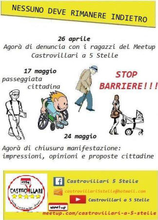 Castrovillari - Nessuno deve rimanere indietro! Stop Barriere!!! Iniziativa del M5S. Il gruppo locale intende sottolineare il diritto dei cittadini tutti, di agire in autonomia mettendo da parte le solite politiche assistenziali che ledono, talvolta, la dignità dell’individuo, volendole cosi sostituire con un approccio strutturale tale da mettere in condizione gli individui di agire autonomamente e liberi di spostarsi in città usufruendo dei servizi necessari all’espletamento di tutte le azioni che per chi non soffre del disagio specifico, da per scontate in quanto , alcune barriere, vengono viste solo da chi porta il fardello di vivere in una città in cui alcuni diritti hanno bisogno di essere pretesi attraverso iniziative come queste. Il ciclo di eventi che coinvolgono la manifestazione di denuncia, sensibilizzazione e proposta del Meetup Castrovillari a 5 Stelle inizieranno giorno 26 aprile: Agorà con i ragazzi del Meetup i quali illustreranno, attraverso la riproduzione d i video già pubblicati sul Canale Youtube Castrovillari a 5 Stelle e sulla pagina Facebook del gruppo, le disattenzioni strutturali e civili della città. Nell’occasione saranno raccolte segnalazioni e proposte. Giorno 17 maggio invece, si darà spazio alla “Passeggiata Cittadina” in cui si percorrerà alcune delle vie della città per evidenziare l’evidente disagio delle persone con difficoltà motorie, ma anche di mamme con passeggini e strumenti per la mobilità dolce. Gli Attivisti invitano tutti i cittadini, soprattutto coinvolti e interessati direttamente dal disagio delle barriere architettoniche (a volte anche inaspettate come vedremo), a partecipare alla passeggiata per testimoniare l’impossibilità di agire in autonomia di alcuni cittadini. La chiusura (si fa per dire) di questo ciclo di eventi si avrà il 24 maggio. In questa occasione ci sarà modo di discutere del percorso fatto assieme: le proposte dei cittadini, le segnalazioni e la testimonianza della manifestazione verranno raccolte in un documento che verrà portato all’attenzione della futura amministrazione. Compatibilmente con gli impegni istituzionali, potranno partecipare i portavoce del Movimento 5 Stelle in Parlamento. Il Meetup auspica che l’evento coinvolga cittadini di ogni ideologia e bandiera politica poiché al di là del’interesse del singolo, le barriere, sono segno di inciviltà e di arretratezza culturale. P.s. il gruppo locale afferma con decisione la lotta a favore dell’abbattimento delle barriere architettoniche che proseguirà anche nel futuro consiglio comunale: Castrovillari avrà la sua squadra a 5 stelle! Meetup Castrovillari a 5 Stelle |