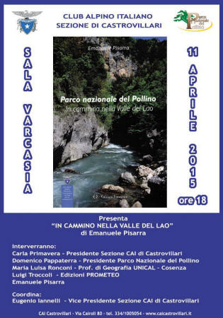Sara' presentato sabato 11 aprile 2015 alle ore 18 presso la Sala Varcasia il nuovo lavoro di Emanuele Pisarra: Parco Nazionale del Pollino " In Cammino nella valle del Lao " un volume che illustra una delle più splendide valli del Parco. Interverranno:Carla Primavera - Presidente Club Alpino Italiano - Sezione di Castrovillari, Domenico Pappaterra - Presidente Ente Parco del Pollino, Maria Luisa Ronconi - Prof. di Geografia UNICAL, Luigi Troccoli - Edizioni Prometeo. Coordina:Eugenio Iannelli - Vice Presidente Club Alpino Italiano - Sezione di Castrovillari. |