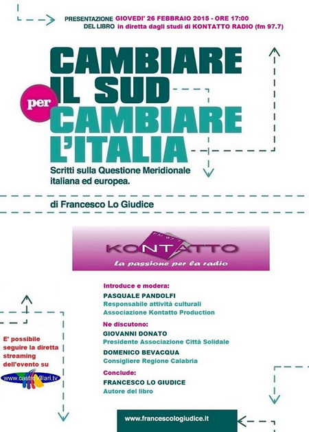 Si terra' giovedi' prossimo negli studi di Kontatto radio la presentazione del libro di Francesco Lo Giudice: " Cambiare il sud per cambiare l' Italia " - Si terra' presso gli studi di Kontatto radio il prossimo giovedi' 26 febbraio alle ore 17,00 la presentazione del libro " Cambiare il Sud per cambiare l' Italia. Scritti sulla questione meridionale italiana ed europea ", Apollo Edizioni,che raccoglie i lavori giornalistici prodotti in sette anni dall' autore. Un testo che tenta di rispondere ai tanti interrogativi che angosciano ragazzi e adulti in fatto di rinascita sociale e che richiede di lasciarsi alle spalle: vittimismo, pessimismo e tanta apatia tra i principali artefici del mancato sviluppo del Sud. Nella prefazione del libro Gianni Pittella lo definisce " un importante esempio di impegno civile che si iscrive nella migliore tradizione del meridionalismo progressista ". Una tematica quella che vuole sviscerare il saggio, che nasconde risvolti e contraddizioni della societa' meridionale ( la radicalità della mafia e il suo diramarsi nel settore politico, imprenditoriale, elitario ), ma al tempo stesso propone alternative portando alla luce pregi e difetti di una terra definita dall’autore - diamante ancora grezzo -. All' incontro moderato da Pasquale Pandolfi, responsabile delle attivita' culturali dell' associazione Kontatto production parteciperanno: Gianni Donato presidente dell' associazione Citta' Solidale e il consigliere regionale della Calabria, Domenico Bevacqua. L' incontro sara' infine concluso dall' autore, Francesco Lo Giudice. L' appuntamento sara' trasmesso live streaming da Castrovillari.tv raggiungibile al seguente indirizzo: www.castrovillaritv/eventi live.htm . |