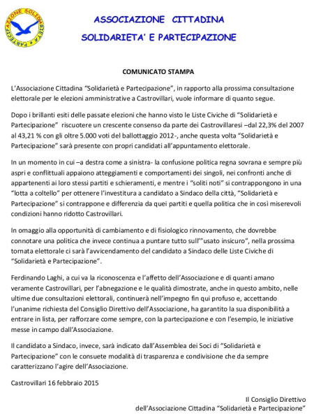 Castrovillari, Ferdinando Laghi fa un passo indietro e non sara' il candidato a sindaco di Castroovillari delle Liste Civiche che verra', invece, deciso dall' assemblea delle stesse - Ha fatto un passo indietro Ferdinando Laghi rispetto a quanto accennato in una recente conferenza stampa ( filmato che trovate qui ). La notizia e' stata diffusa tramite un comunicato dell' associazione cittadina " Solidarieta' e Partecipazione " che nello stesso specifica: " In un momento in cui a destra come a sinistra la confusione politica regna sovrana e sempre piu' aspri e conflittuali appaiono atteggiamenti e comportamenti, e mentre i " soliti noti " si contrappongono in una " lotta a coltello " per ottenere l' investitura a candidato a sindaco della citta', " Solidarieta' e partecipazione " si differenzia da quei partiti che in cosi' miserevoli condizioni hanno ridotto Castrovillari. Ferdinando Laghi, a cui va la riconoscenza e l' affetto dell' associazione per l' abnegazione le qualita' dimostrate anche in questo ambito nelle ultime due consultazioni elettorali continuera' nell' impegno fin qui profuso e, accettando l' unanime richiesta del consiglio direttivo dell' associazione ha garantito la disponibilita' a entrare in lista per rafforzare sempre con la partecipazione e con l' esempio le iniziative messe in campo ... Il candidato a sindaco sara’, invece, deciso in modo concorde dall’ assemblea dei soci dell’ associazione con le consuete modalita’ di trasparenza e condivisione che da sempre la caratterizzano “. |