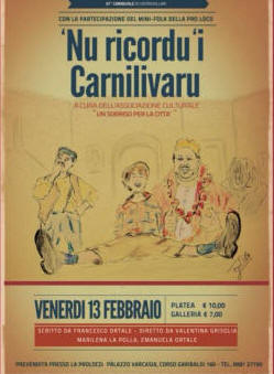 CARNEVALE DI CASTROVILLARI E DEL POLLINO VENERDI' 13 FEBBRAIO AL SYBARIS L' ASSOCIAZIONE " UN SORRISO PER CASTROVILLARI " PRESENTA LO SPETTACOLO; " NU RICORDU 'I CARNILIVARU " - L’ Associazione "Un Sorriso per la Città", in collaborazione con la Pro Loco cittadina, terrà, venerdì 13 febbraio alle ore 20,30 , presso il teatro comunale " Sybaris ", terrà uno spettacolo dal titolo "Nu Ricordu 'i Carnilivaru", inserito nel variegato cartellone della 57 edizione del Carnevale di Castrovillari. Protagonisti saranno i bambini - com'è giusto che sia a Carnevale! – dell’associazione con la partecipazione fondamentale dei “ Piccoli della Pro Loco” diretti magistralmente da Valentina Grisolia, che si esibiranno in canti e balli del formidabile repertorio delle tradizioni popolari castrovillaresi. Il lavoro è stato scritto da Francesco Ortale, presidente dell’Associazione “ Un Sorriso per la città”.La trama si dipana a partire da una tenera, invincibile nostalgia del protagonista che rivive (e farà rivivere agli spettatori) un momento carnascialesco particolarmente gioioso e spassoso della sua infanzia, evocando tra l'altro figure più o meno fantastiche, ma ben radicate nell'immaginario popolare. I bambini che reciteranno sono: Ester Pignatato, Rosalina Sancineti, Simone e Marianna Graziadio Emanuele Aversa, Rosa Maria Aversa, Miriam Festa, Vittorio Gialdino, Michele Pignataro. Per info e prevendita Pro loco Castrovillari C.so Garibaldi, telefono e fax 0981-27750 Fasanella telefonia Via Roma c/o botteghino |