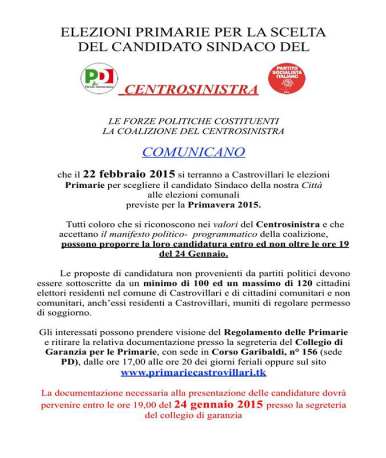 CASTROVILLARI LE PRIMARIE DEL CENTRO SINISTRA PER LE ELEZIONI COMUNALI 2015 SI TERRANNO IL 22 FEBBRAIO |