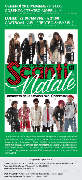Castrovillari, il 29 dicembre Scena Verticale presenta: " Scanti di Natale " - Concerto di Natale a Castrovillari il prossimo 29 dicembre con la " Omissis Mini Orchestra ": Dario De Luca, Francesco Montebello, Gianfranco De Franco, Emanuele Gallo, Giuseppe Oliveto, Paolo Chiaia, Cecilia Foti, Aquila Abbate, Mattia Tenuta, Alessandra Chiarello, Federica Perre. Un progetto di Scena Verticale che propone la rivisitazione brillante, briosa e condita da tanta ironia dei pezzi classici della tradizione natalizia: White Christmas, Jingle Bell Rock, Silent Night, More Than Words ( versione italiana ). Un appuntamento da non perdere con inizio alle ore 21 al Teatro Sybaris del Protoconvento Francescano. Il costo del biglietto e' di 10€ ( 10 euro ), il ridotto per under 16 ed over 60 costa 8€ ( 8 euro ), la prevendita dei biglietti viene effettuata presso Dany Music in via Mazzini per ulteriori info si puo' telefonare allo 0981.27084. Il concerto viene anche proposto al Teatro Morelli di Cosenza venerdi' 26 dicembre sempre con inizio alle ore 21. |