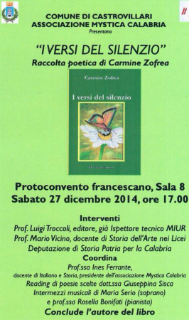 CASTROVILLARI - SI TERRA' SABATO 27 DICEMBRE CON INIZIO ALLE ORE 17 PRESSO IL PROTOCONVENTO FRACESCANO DI CASTROVILLARI LA PRESENTAZIONE DEL LIBRO " I VERSI DEL SILENZIO ", RACCOLTA POETICA DI CARMINE ZOFREA |