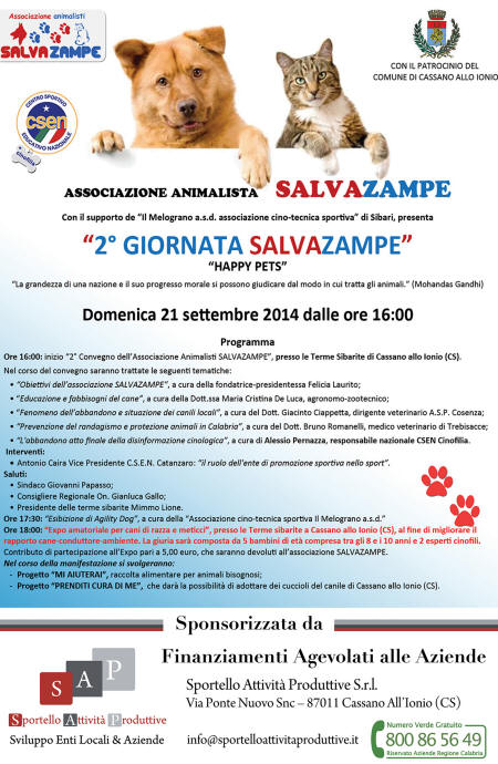 Domenica 21 settembre alle Terme Sibarite la II giornata SalvaZampe, Happy Pets! - L' associazione animalista SalvaZampe, con il supporto dell' A.S.D. Il Melograno, associazione cino-tecnica sportiva di Sibari, ha organizzato la II giornata Salvazampe, happy pets! Scriveva Gandhi – ha esordito la presidente Felicia Laurito – la grandezza di una nazione e il suo progresso morale si possono giudicare dal modo in cui tratta gli animali. Tante le attivita' in programma in questa seconda giornata, inserita nella seconda edizione di " Terme Sibarite ... sotto le stelle " che si terrà domenica 21 settembre 2014 dalle ore 16:00. «È stato un lavoraccio – ha continuato la presidente – abbiamo in programma, oltre ai saluti istituzionali, sei interventi tecnici, una esposizione e una expo con gara i cui giurati saranno 5 bambini di età compresa tra gli 8 e i 10 anni e 2 esperti cinofili. Ma a parte questi dati tecnici ringrazio il dott. Peppino Bonanno, Amministratore della società Sportello Attività Produttive Srl, azienda leader nel fornire ai comuni uno strumento di sviluppo locale basato sull’ottimizzazione di risorse pubbliche, che si è dimostrato sensibile alle tematiche sociali e della salvaguardia degli animali e, in virtù di questo, ha voluto essere lo sponsor principale della nostra manifestazione. Sono felicissima per l’impegno profuso da SAP perché ci ha permesso di organizzare in modo più dettagliato la manifestazione rispetto all’anno passato e ringrazio anche gli altri sponsor che si sono spesi per questo evento». |