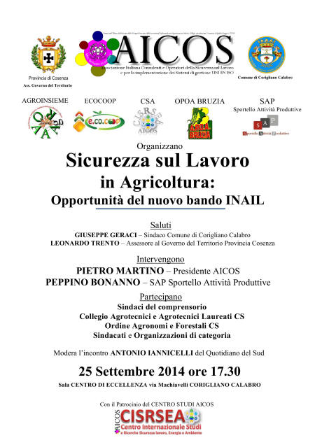 GIOVEDI' 25 SETTEMBRE A CORIGLIANO CALABRO, CONVEGNO SULLA SICUREZZA SUL LAVORO IN AGRICOLTURA |