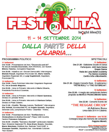 GIOVEDI' 11 SETTEMBRE PRENDERÀ IL VIA A CASTROVILLARI LA FESTA DELL' UNITA', IL PROGRAMMA COMPLETO |