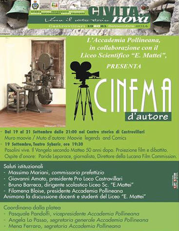 Civita...nova 2014 - L' Accademia Pollineana propone " Cinema d' autore ": il Muro moovie/ Muto d’autore, Moovie legends and Comics ( Dalle 21:00 nel Centro storico di Castrovillari ) e il convegno " Pasolini vive. Il Vangelo secondo Matteo 50 anni dopo ". Proiezione del film nella versione restaurata. A cui seguira' un dibattito animato da docenti e studenti del Liceo Scientifico " Enrico Mattei ". Ospite d' onore e conduttore: Paride Leporace, giornalista, direttore della Lucana Film Commission. Il Muro moovie, già proposto dall’Accademia Pollineana nell’Edizione di Civita nova dello scorso anno, rappresenta un momento di animazione nel centro storico di Castrovillari dove, su alcune pareti che si prestano allo scopo, saranno proiettate -senza sonoro- alcune delle pellicole in bianco e nero o spezzoni delle stesse che, a partire dal lontano 1936, nel nostro Paese, hanno segnato un’epoca, portando alla ribalta grandi attori ed interpreti del genere comico e della commedia brillante all’italiana, come Totò, Peppino De Filippo, Amedeo Nazzari, Vittorio De Sica, Vittorio Gassman, Alberto Sordi, Alida Valli, Marcello Mastroianni, Gino Cervi, Aldo Fabrizi, Anna Magnani (per citarne solo alcuni tra i più eminenti). Durante il convegno sul tema “Pasolini vive”, fissato per giorno 19 Settembre, alle ore 19:30, presso il Protoconvento Francescano di Castrovillari, il famoso giornalista e scrittore Paride Leporace, direttore della Lucana Film Commission, condurrà un dibattito -dopo la proiezione del film –su “Il Vangelo secondo Matteo cinquant’anni dopo”. Questo è l’omaggio che il Consiglio direttivo dell’Accademia Pollineana (Filomena Bloise, Mena Ferraro, Pasquale Pandolfi, Angela Lo Passo, Gianluigi Trombetti e Paolo Rende- rispettivamente presidente, segretaria, vicepresidente, segretaria generale, bibliotecario, tesoriere-) intende rivolgere alla figura di Pier Paolo Pasolini, come anteprima di un grande evento proposto dal Commissario prefettizio Massimo Mariani, che ha invitato pubblicamente l’Accademia a progettare e realizzare, anche in sinergia con altre associazioni culturali, per il prossimo anno 2015, in occasione del quarantennale della morte di questo autore, una rassegna sull’opera completa di uno di più grandi intellettuali, scrittori, poeti e registi del Novecento. Durante il Convegno di giorno 19 c.m., in cui unico relatore sarà Paride Leporace (ospite d’onore della manifestazione), dopo i saluti del commissario prefettizio Massimo Mariani, del presidente della Pro Loco di Castrovillari, Giovanni Amato, del preside del liceo Scientifico “Enrico Mattei”, prof. Bruno Barreca e della presidente dell’Accademia Pollineana Filomena Bloise, che introdurrà alla proiezione del film “Il Vangelo secondo Matteo” nella versione restaurata dell’originale, risalente al 1964, lo stesso Leporace condurrà il dibattito successivo, animato da docenti e studenti che, con il pubblico presente in sala, saranno coinvolti sulle questioni inerenti al film. Coordineranno dalla platea Pasquale Pandolfi, Angela Lo Passo e Mena Ferraro. Occorre ricordare che il quotidiano Repubblica, in data 22 luglio 2014, nell’articolo “Ha 50 anni Il Vangelo secondo Matteo. E la Chiesa lo riabilita”, di Guido Crainz, postato sul sito R.it, ha ribadito che “l’Osservatore romano” lo definisce”: “Il miglior film su Gesù mai girato”, mentre quando arrivò nelle sale fu duramente contestato ed, infine, censurato. Lieta di poter affiancare la Pro Loco di Castrovillari e la Consulta Scientifica nella VI Edizione di Civita nova, anno 2014, l’Accademia Pollineana invita tutti gli estimatori e gli interessati a queste iniziative, alla più viva ed auspicata estesa e diffusa- partecipazione della cittadinanza. La presidente e coordinatrice Filomena Bloise