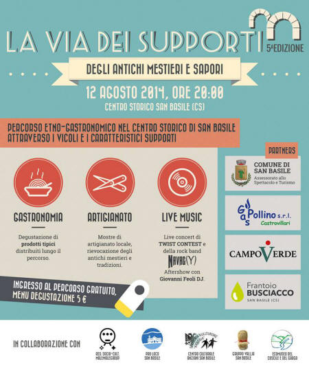 LA VIA DEI SUPPORTI DEGLI ANTICHI MESTIERI E SAPORI - Quinta edizione del percorso etno-gastronomico nel cuore del centro storico di San Basile. Tradizione, gusto e cultura da scoprire tra i vicoli dell' abitato arbereshe. Valorizzare il centro storico del borgo arbereshe, portato all' attenzione della stampa nazionale ed internazionale con il progetto " Una casa a San Basile ", attraverso un percorso etno-gastronomico che racconta la tradizione puntando sui prodotti tipici della cucina dell' arberia, i vecchi mestieri e la storia della comunità. San Basile si prepara alla quinta edizione de “La via dei supporti degli antichi mestieri e sapori” organizzata dall’associazione culturale Malemale group, in collaborazione e sinergia con l’Amministrazione Comunale, guidata dal Sindaco, Vincenzo Tamburi, la Pro Loco, l’Eco Museo del Coscile e del Garga, il Centro Culturale Anziani ed il Gruppo Vallja. Gastronomia, artigianato, musica. E’ questa la proposta della quinta edizione de La via dei supporti degli antichi mestieri e sapori in programma domani 12 agosto nel centro storico di San Basile. L’edizione 2014 proporrà un percorso etno-gastronomico che partirà da Via Matteotti, vicolo caratteristico del centro storico, per proseguire su Via della Libertà dove sono presenti ben 4 supporti, prima di arrivare in Via Duca D’Aosta che attraversa tutto l’abitato antico della comunità arbereshe e porta in Piazza Sant’Anna (Ka konza) dove si conclude il percorso e si esibiscono gli ospiti musicali della serata. A partire dalle ore 20 il borgo di San Basile si anima al ritmo della tradizione arbereshe, coccolando turisti e visitatori con i sapori di arberia in un percorso di gusto che punta a riscoprire la bellezza del centro storico su cui l’Amministrazione comunale ha puntato programmaticamente sviluppando il concetto di albergo diffuso anche attraverso alcuni interventi in corso d’opera che metteranno a disposizione dei turisti diverse strutture del centro abitato.La serata – che vede tra i partners Campoverde, il frantoio Busciacco e la Gas Pollino – offrirà anche un menù degustazione (al costo di 5€) che prevede le caratterisitiche petule (vecchiarelle) fritte al momento, bruschette di pane del forno di San Basile condite con olio locale e sardine, i tumac (maccheroni al sugo), salsiccia alla brace e il tortno (dolce tipico della tradizione arbreshe) accompagnato da marmellata fatta in casa. Musica dal vivo con il live concert di Twist Contest e la rock band Navag(y). Aftershow con Giovanni Feoli dj. |