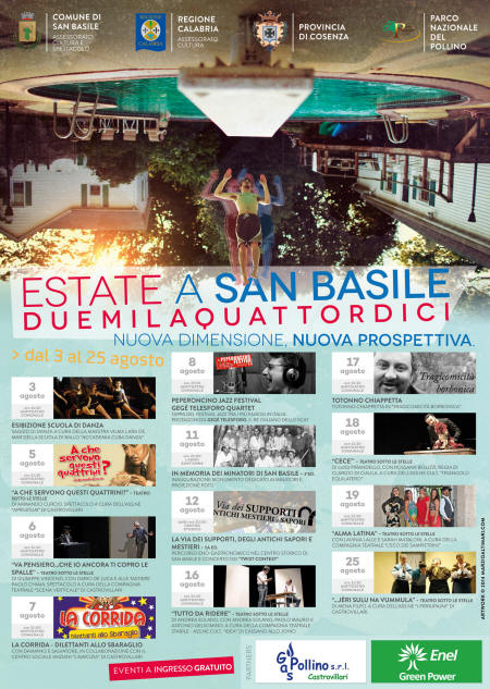 ESTATE A SAN BASILE ECCO IL PROGRAMMA. DODICI APPUNTAMENTI IN UN MESE. DAL 3 AL 25 AGOSTO MUSICA, SPETTACOLO, TEATRO, TRADIZIONE, STREETFOOD, CULTURA. TUTTO AD INGRESSO GRATUITO |