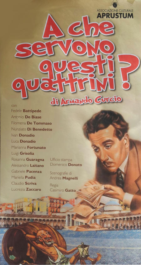 APRUSTUM debutta con " A che servono questi quattrini? " di Armando Curcio. Ecco le prime date del tour estivo. Inizia la tournee estiva per l' associazione culturale Aprustum che porta nei teatri e nelle piazze calabresi " A che servono questi quattrini? ", la celebre commedia scritta da Armando Curcio e resa famosa dal film omonimo con Eduardo e Peppino De Filippo. Diretto da Casimiro Gatto, lo spettacolo in tre atti, fa il suo debutto martedì 29 luglio nella rassegna estiva "Restate a Rocca Imperiale", promossa dal Comune di Rocca (Piazza Monumento, ore 21,30). Il 5 agosto Aprustum farà tappa all’anfiteatro di San Basile, mentre il giorno dopo sarà ospite nell’anfiteatro “Belluscio” di Altomonte. Giovedì 7 agosto “A che servono questi quattrini?” sarà in scena all’auditorium degli Orti Mastromarchi a Saracena. “Il danaro non ha mai dato la felicità a nessuno! Specialmente quann'è poco! " dice lo sprovveduto Vincenzino Esposito con una riserva di popolana ironia che mette in discussione la tesi del suo maestro filosofo, lo spiantato marchese Eduardo Parascandolo, barbone metafisico. Costui si aggira per i vicoli e i bassi di Napoli, raccogliendo adepti tra gli emarginati e i semplici che plagia con le sue bizzarre e fascinose teorie: “il denaro è un trucco, serve solo ad apparire ciò che non si è” secondo il vecchio furbo Professore. E di conseguenza il faticoso lavoro che lo procura è inutile; la vita è il dolce far niente, l'ozio filosofico, la liberazione della fantasia; la ricchezza inventata può procurare gli stessi vantaggi della ricchezza reale. Tesi che si ribalta in comico paradosso quando la sua applicazione esige al contrario frenetica organizzazione, competenza commerciale, astuzie e praticità dinamiche e non più contemplative che sistemeranno non solo l'incolto Vincenzino, ma pure il suo geniale maestro, inventore di un'eredità inesistente e comunque felicemente risolutiva. Scritta con successo da Armando Curcio per i De Filippo, alla vigilia della seconda guerra, prima che il furore attivo degli eventi devastasse ogni dolcezza, “A che servono questi quattrini?” sa smitizzare con garbo incensurabile retoriche corporativiste o stakanoviste di quegli anni esaltati. La sceneggiatura è condita con battute tanto brillanti quanto intelligenti sul rapporto delle persone con i beni materiali, con l’apparire nella società, con le dinamiche uomo-donna nella vita di coppia. Il tutto con buon gusto e senza mai scadere in volgarità. In quest'epoca di furia tecnologica, avvelenata dall'ansia di denaro e dal consumismo dissennato, la compagnia Aprustum (reduce dai successi de “Le voci di dentro” e di “Lu curaggio de nu pompiere napoletano”), porta in scena questa surreale commedia di Curcio affinché sia divertita riflessione per rivalutare, assolvendoli dal senso di colpa, anche il tempo improduttivo, le pause inerti che rivitalizzano la fantasia e il piacere del sentirsi vivere. Sulla scena ci saranno Fedele Battipede, Antonio De Biase, Filomena De Tommaso, Nunziato Di Benedetto, Ivan Donadio, Luca Donadio, Marianna Fortunato, Luigi Grisolia, Rosanna Guaragna, Alessandro Laitano, Gabriele Pacenza, Mariella Pudia, Claudio Scriva e Lucrezia Zaccaro. Le scenografie sono di Andrea Magnelli. DOMENICO DONATO UFFICIO STAMPA APRUSTUM |