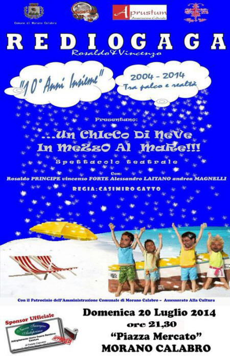 A MORANO CALABRO, DOMENICA 20 LUGLIO " ... UN CHICCO DI NEVE IN MEZZO AL MARE !!! ", PER FESTEGGIARE I DIECI ANNI DEL " REDIO GAGA ", L' ESILARANTE SHOW RADIOFONICO CONDOTTO DA ROSALDO & VINCENZO. MORANO CALABRO |
