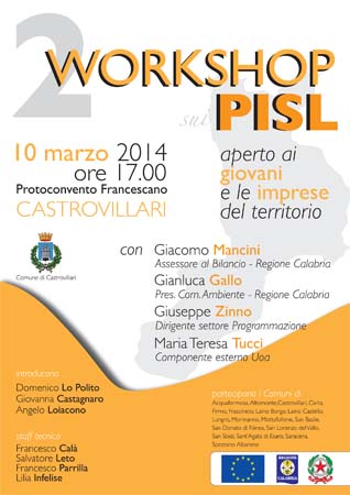 CASTROVILLARI/PROGETTI INTEGRATI DI SVILUPPO LOCALE. IL SECONDO WORKSHOP CON I GIOVANI E LE IMPRESE ALLA PRESENZA DELLA REGIONE IL PROSSIMO LUNEDI' 10 MARZO |