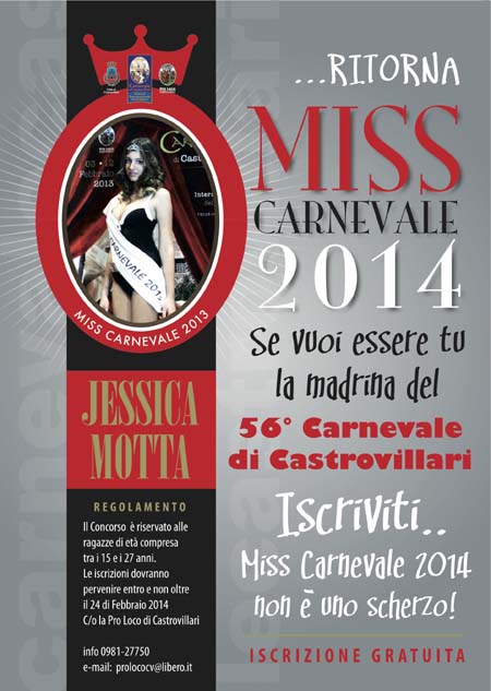 56° CARNEVALE DI CASTROVILLARI E DEL POLLINO, FESTIVAL INTERNAZIONALE DEL FOLKLORE DAL 22 FEBBRAIO AL 4 DI MARZO 2014 - MISS CARNEVALE 2014 - Manca ormai davvero pochissimo all' inizio del 56° Carnevale di Castrovillari e cresce di giorno in giorno l' attesa per quello che ad oggi non è più soltanto l’evento carnascialesco piu' importante e famoso della Calabria, ma un evento che negli anni ha saputo conquistarsi un posto tra i carnevali più caratteristici d' Italia. Organizzato dalla Pro Loco cittadina (presieduta da Giovanni Amato) con il contributo del Comune di Castrovillari, e delle istituzioni calabresi nonche' di numerosi sponsor privati, l' evento, come sempre diretto artisticamente da Gerardo Bonifati, si svolgera' dal 22 febbraio al 4 di Marzo 2014 e per 10 giorni riversera' colori e allegria nella citta' del Pollino, richiamandovi, anche quest' anno, turisti e appassionati provenienti da tutto il Meridione. Dopo la presentazione del manifesto che accompagnerà l’evento, che si è svolta nei giorni scorsi presso la sede della BCC Medio Crati di Rende, vicina alla manifestazione e in attesa che il prossimo 22 di Febbraio a Villa Bonifati venga svelato il programma, il Carnevale di Castrovillari, da qualche anno a questa parte ha inserito nel cartellone diversi appuntamenti e tra questi il concorso “MISS CARNEVALE” che ha fatto la sua apparizione nel 2010, in quella occasione ad essere incoronata fu la tarantina Vita La Rizza. Un appuntamento che è cresciuto negli anni, grazie alla direzione artistica di Carlo Catucci, che nella città del pollino porta tantissime ragazze provenienti non solo dall’hinterland e dalla provinciali Cosenza ma anche da altre regioni dal momento che, il Carnevale di Castrovillari è annoverato tra i 10 più importanti d’Italia. Nel 2011 la fascia del concorso è andata alla castrovillarese Brenda Tramaglino ;nel 2012 a Cristina Alfano 15 anni di Corigliano; nel 2013 a Jessica Motta 16 anni di San Marco …e quest’anno chi sarà la reginetta della manifestazione carnascialesca ? Da sottolineare che la futura Miss Carnevale sarà la madrina di tutte le manifestazioni dell’evento ; per cui chi volesse partecipare e ha una età compresa tra i 15 e i 27 anni , può iscriversi, gratuitamente, telefonando al numero 0981-27750 – oppure tramite fb agli indirizzi della Pro Loco di Castrovillari. Affrettati c’è tempo fino a lunedì 24 Febbraio. Intanto continuano senza sosta i preparativi e in molte case si è al lavoro ormai giorno e notte per rifinire gli ultimi particolari di abiti, maschere e accessori da sfoggiare nel corso delle due sfilate di domenica 2 e di martedì 4 Marzo . Quest’anno il focus di approfondimento sarà dedicato al Cile. Ufficio stampa - Anna Rita Cardamone |