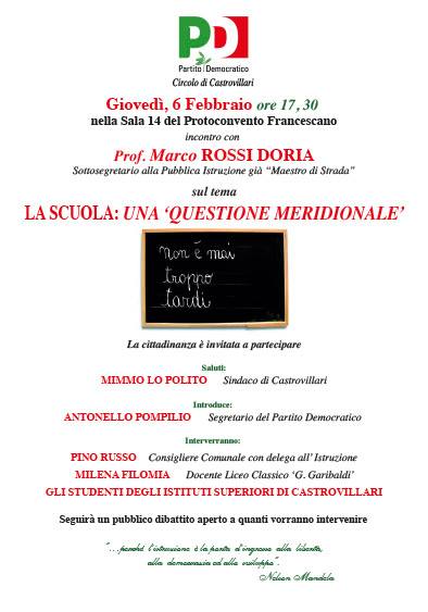 " LA SCUOLA UNA QUESTIONE MERIDIONALE. NON E' MAI TROPPO TARDI " INCONTRO-DIBATTITO AL PROTOCONVENTO FRANCESCANO DI CASTROVILLARI A PARTIRE DALLE ORE 17.30 |