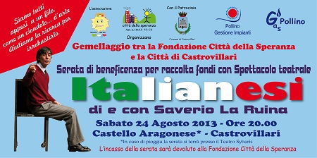 CASTROVILLARI. IL 24 AGOSTO SERATA DI BENEFICIENZA CONTRO LE NEOPLASIE INFANTILI. IL CAPOLUOGO DEL POLLINO SI GEMELLA CON LA FONDAZIONE CITTA' DELLA SPERANZA |