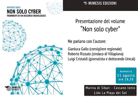 Mimesis edizioni - Comunicato Stampa. Presentazione del nuovo libro di Antonio Tursi. Non solo cyber a Marina di Sibari – Cassano allo Ionio, domenica 11 agosto ore 18.30 presso il Lido Playa del Sol - Mimesis edizioni organizza domenica 11 agosto (ore 18.30) presso il Lido Playa del Sol di Marina di Sibari – Cassano allo Ionio la presentazione del nuovo libro di Antonio Tursi, Non solo cyber. Un volume che raccoglie gli articoli apparsi nell’omonima rubrica della rivista l’Espresso. Gianluca Gallo (consigliere regionale), Roberto Rizzuto (sindaco di Villapiana), Luigi Cristaldi (giornalista e dottorando Unical) discuteranno con l’autore le varie problematiche legate alla diffusione e all’utilizzo delle nuove tecnologie di comunicazione come Internet e gli smartphone. L’incontro si inserisce in un ciclo di presentazioni del volume in diverse località balneari calabresi (sabato 10 agosto a Schiavonea – Corigliano Calabro, mercoledì 14 agosto a Diamante, mercoledì 28 agosto a Marina di Acquappesa).