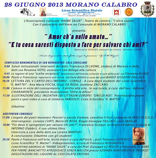 COMUNICATO STAMPA ASSOCIAZIONE CULTURALE " ANIME SALVE " - OGGETTO: " Amor ch' a nullo amato… " - " E tu cosa saresti disposto a fare per salvare chi ami ? " E' il tempo del " mal d' amore ", una vera e propria emergenza sociale che impone una seria riflessione sul senso ed i limiti, sul significato profondo e sulla capacitA' di lettura del cuore umano, dei suoi momenti di luce, cosi' come dei suoi momenti di inquietudine e persino di patologia, in relazione al SENTIMENTO DELL' AMORE, come lo percepivano gli antichi, come lo hanno tramandato i classici, come lo declina la società odierna, come lo vivono, in particolare, i giovani, anche e soprattutto non solo in virtù degli sconcertanti eventi di cronaca che vedono aumentare vertiginosamente il numero delle donne vittime del “femminicidio”, ma anche in funzione del “diritto alla felicità” che ogni essere umano-maschio o femmina-ricerca incessantemente tra le pieghe della “lotta per l’esistenza”. Alcuni processi in atto, rivelano altresì una incompiuta o disomogenea evoluzione dell’identità maschile, in rapporto al femminile e viceversa; o meglio di un certo modello forse ancora imperante nel composito universo maschile, ancora più delicato e suscettibile di improvvisi cambiamenti, rispetto al corrispettivo universo femminile, abituato da secoli di lotta per l’emancipazione, alla resilienza ed al dialogo culturale attinente all’identità di genere. Poichè l’amore non può e non deve essere presentato solo sotto la luce negativa e drammatica del caos e del disordine, ma necessariamente deve trovare la sua giusta collocazione nel cuore dell’uomo e della donna, così come in società, come la forza più grandiosa che trasforma la realtà umana e ne realizza le più alte e nobili finalità, l’associazione “Anime salve”, condotta dal prof. Giuseppe Lo Polito, dall’ing. Tommaso Ferrari e dalla prof.ssa Filomena Minella Bloise, si è proposta di narrarne anche gli aspetti più edificanti ed affascinanti. (Dalle finalità del progetto “Amor ch’a nullo amato…”) * Con il patrocinio dell’Amministrazione comunale guidata dal dott. Francesco Di Leone, coadiuvato dal Vicesindaco, con Delega alla cultura, dott.ssa Rosanna Immacolata Voto (d’intesa con il Liceo Scientifico “E. Mattei” di Castrovillari, con la locale Pro Loco e con l’ I.R.S.D.D. di Cassano all’Jonio), si svolgerà a Morano Calabro, in due sessioni- antimeridiana e pomeridiana- rispettivamente presso la Sala Consiliare nel Complesso monumentale di san Bernardino, dalle 9:00 alle 12:00, e nell’Auditorium comunale, dalle 17:00 alle 22:00, un’intera giornata di approfondimento culturale legata all’amore, “debolezza” gloriosa dell’anima, come lo definisce Gianfranco Ravasi. A promuovere l’evento (con la collaborazione della Compagnia Calabria Citra di Morano, il Centro I.A.T.e l’associazione “Oltre la difesa”, unitamente al Movimento Italiano per la Vita )è l’associazione culturale “Anime Salve”, condotta dal prof. Giuseppe Lo Polito, dall’ing. Tommaso Ferrari e dalla prof.ssa Filomena Minella Bloise, che dal 2005 opera sul territorio nel promuovere temi e testi emergenti nel dibattito culturale. Per citare solo alcuni titoli, si ricordano gli spettacoli culturali “Matematic@mente diamo i numeri”, sulla matematica e la numerologia, “Viaggi e miraggi”, sul tema letterario per eccellenza-di odissiaca memoria-, “Noi siamo figli delle stelle”, su argomenti dell’astronomia. L’iniziativa nasce dalla volontà di proporre una rilettura dell’inferno dantesco, fonte ineguagliabile di ispirazione per poeti e scrittori di ogni tempo ed in particolare del canto V dell’Inferno, in cui è narrata dal “divin poeta”, Dante Alighieri, una delle più celebri storie d’amore di ogni tempo, quella dei due amanti e cognati Paolo Malatesta, fratello di Gianciotto,”rustico uomo”, zoppo e deforme, signore di Rimini e Francesca di Guido da Polenta, signore di Ravenna. La “metamorfosi di Dante” e del suo poema, suggestivo titolo comparso sul Domenicale del Sole 24 Ore di questa settimana, in cui Quirino Principe indaga la ricezione di Dante in Italia, riguarda nell’evento di “Anime Salve”, intitolato non a caso “Amor ch’a nullo amato…”, la riproposizione del testo dantesco, ma anche la sua attualizzazione, in particolare attraverso i più letti romanzi di ispirazione dantesca del momento : l’ “Inferno” del “super scrittore” Dan Brown (Mondadori), suo sesto romanzo thriller, e l’ “Inferno” di Francesco Gungui (Fabbri), affermato scrittore ed editor milanese che ha recentemente concluso alla Feltrinelli di Roma un tour letterario di grande successo e che sarà ospite illustre ed attesissimo della kermesse culturale moranese, intervistato da Lorena Martufi. Un’occasione questa moranese davvero “ghiotta” per tutti coloro che, giovani e meno giovani, avranno voglia di interrogarsi sulla domanda cruciale “ E tu cosa saresti disposto a fare per salvare chi ami?”, sottotitolo del robusto romanzo fantasy di Francesco Gungui, e di ritrovarsi a parlar d’amore confrontandosi con i relatori d’eccezione che animeranno il dibattito: il prof. Biagio Giuseppe Faillace con la sua personale Lectura Dantis, affiancato dalle studentesse Ana Maria Focsa, Giusi De Rosa e Joselena Zaccaro che si destreggeranno in un reading poetry del canto dei lussuriosi, Lorenzo Curti, lo stesso Giuseppe Faillace, Mario De Rosa ed il giovane poeta Luca Sbaglia che animeranno l’auditorium comunale alle ore 17:00 con “Pensieri e parole d’amore”, coordinati dal prof. Leonardo Alario, antropologo, presidente dell’I.R.S.D.D. Anche la storia dell’arte è chiamata in causa con un repertorio di arti visive sul tema, proposto dall’arch. prof. Francesco Covucci del Liceo “Mattei”, affiancato per le video-proiezioni dal giovane Francesco Rosignuolo, mentre il prof. Giuseppe Lo Polito, co