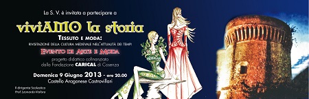 A margine di questa esperienza c’è stato un approfondito percorso di studio circa la conoscenza delle usanze, delle tradizioni e degli stili di vita del medioevo che sicuramente ha stimolato gli allievi a prendere coscienza dell’evoluzione storico-culturale dell’uomo, delle proprie competenze e qualità e delle proprie capacità creative. La manifestazione conclusiva: sfilata di arte e moda, presenterà 40 abiti finemente decorati dagli allievi dell’istituto, si terrà giorno 9 giugno 2013, alle ore 20.00, presso il Castello Aragonese, in Castrovillari. |