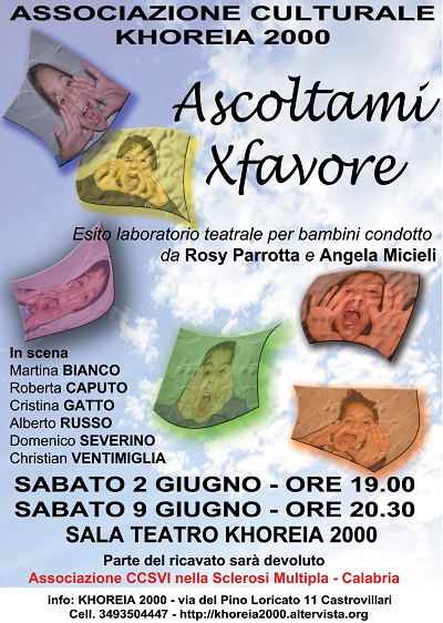 Ascoltami Xfavore, è una richiesta. Ascoltami Xfavore è uno spettacolo. Ed ecco, che attraverso il teatro i bambini vogliono arrivare agli adulti. A quegli adulti sordi o semplicemente troppo distratti. Lo spettacolo Ascoltami Xfavore previsto in scena per sabato 2 giugno alle ore 19.00 e sabato 9 giugno alle ore 20.30, presso la Sala Teatro Khoreia 2000 di Castrovillari, è il frutto del laboratorio teatrale condotto da Rosy Parrotta e Angela Micieli presso l’Associazione Culturale Khoreia 2000 e incentrato proprio sull’ascolto. Emozioni nascoste, desideri, gioie e dolori hanno trovato la loro forma espressiva in una sorta di diario segreto sonoro. Alberto, Roberta, Domenico, Martina, Christian e Cristina si sono raccontati e Rosy Parrotta li ha ascoltati. Ma, per l’occasione, i piccoli attori non sono stati gli unici a essere stati ascoltati. Un’altra richiesta aveva bisogno di “amplificazione” ed ecco che la responsabilità sociale, che contraddistingue l’Associazione Culturale Khoreia 2000, questa volta rivolge l’attenzione all’Associazione CCSVI nella sclerosi multipla – Calabria. Associazione regionale nata con l’intento di incoraggiare, coordinare e sostenere la ricerca rivolta alla prevenzione, diagnosi e cura della Sclerosi Multipla con particolare riferimento alle sue connessioni con l'Insufficienza Venosa Cronica Cerebro - Spinale (CCSVI); aiutare e sostenere le persone con sm e i loro familiari; diffondere nel sistema socio - sanitario e nella società civile informazioni scientifiche concernenti i risultati delle ricerche sulle due patologie; promuovere e sostenere la ricerca scientifica; collaborare e cooperare con il sistema sanitario nazionale e con il sistema socio - sanitario assistenziale privato. Non resta che dire Ascoltami Xfavore. |