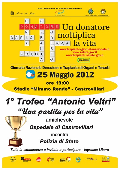 Un donatore moltiplica la vita, è lo slogan della giornata nazionale dedicata alle donazioni ed ai trapianti d' organo che si celebra il prossimo 25 maggio - Anche quest’anno, sotto l’Alto Patronato della Presidenza della Repubblica, il Ministero della Salute, insieme alle Associazioni e il Centro Nazionale Trapianti, ha promosso la Giornata Nazionale Donazione e Trapianto che sara' arricchita da manifestazioni ed eventi, con il sostegno e la collaborazione delle Regioni e Province Autonome, degli Enti Locali e delle istituzioni sanitarie. Per l' occasione a Castrovillari presso il campo sportivo " Mimmo Rende", verra' disputato il primo trofeo di calcio " Antonio Veltri ", una partita per la vita, che prevede l' incontro di calcio, tra i dipendenti dell' ospedale di Castrovillari e quelli della polizia di stato. L' ingresso è gratuito e l' appuntamento è per le ore 19. Un' occasione utile per poter evidenziare l' utilita' sociale delle donazioni. L' evento verra' trasmesso live streaming su www.castrovillari.tv. |