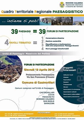 COMUNICATO - CASTROVILLARI. ALTA LA PARTECIPAZIONE AL FORUM PER LA FORMAZIONE DEL QUADRO TERRITORIALE REGIONALE PAESAGGISTICO - Considerevole partecipazione di associazioni ed istituzioni al Protoconvento Francescano di Castrovillari per la formazione del Quadro Territoriale Regionale Paesaggistico, i cui obiettivi sono quelli di condividere le proposte di salvaguardia, di conservazione e di trasformazione; di accogliere le eventuali nuove proposte e/o modifica delle aree tutelate; di proporre nuove aree a forte valenza identitaria su cui porre attenzione; di segnalare e individuare “paesaggi dinamici” in cui sono in attesa i processi di sviluppo e crescita. Quello organizzato a Castrovillari, è uno dei 39 appuntamenti che la Regione Calabria ha predisposto con la collaborazione degli enti locali. Al forum erano presenti le municipalità di Morano Calabro con l’Assessore Rosanna Anele, di Civita con il Sindaco Vittorio Blois, di San Basile con l’Assessore Angelo Boccia, di Frascineto con il Sindaco Francesco Pellicano, di Saracena con il Sindaco Mario Albino Gagliardi, nonché l’Assessore Biagio Diana della Provincia di Cosenza, i dottori Luppino e d’Alessio della Soprintendenza dei beni archeologici, il dottore Bianco della Soprintendenza per i beni architettonici e paesaggistici di Cosenza, il presidente dell’Ente Parco del Pollino, l’onorevole Mimmo Pappaterra, la Comunità Montana del Pollino rappresentata anche dal dottore Giuseppe Salerni e lo staff tecnico del dipartimento di Urbanistica regionale guidato dall’architetto Saverio Putortì. Il Comune di Castrovillari è intervenuto con lo staff tecnico del Settore Urbanistica, guidato dal responsabile ingegnere Roberta Mari oltre che dal Sindaco Franco Blaiotta che ha richiamato, particolarmente soddisfatto, il grande significato della giornata , scandita anche da un break presso il Castello Aragonese per far ammirare la bellezza del maniero recuperato. Per il comprensorio del “Massiccio del Pollino” e per la stessa città di Castrovillari – ha sostenuto il primo cittadino - l’appuntamento è stato l’occasione per fare il punto sull’enorme patrimonio tra ambienti naturalistici, paesaggistici e testimonianze architettoniche di pregevole fattura, che sicuramente saranno inseriti, con altri, nel documento finale che verrà sottoposto alla Regione. L’incontro ha coinvolto oltre le istituzioni locali anche i cittadini, gli imprenditori, i professionisti, le associazioni di volontariato, culturali, ambientalistiche e protezionistiche. Durante l’appuntamento sono stati illustrati gli obiettivi e costituiti i Tavoli di approfondimento per la migliore acquisizione delle proposte. Il Quadro Territoriale Regionale Paesaggistico è il Piano Urbanistico per il governo del Territorio e del Paesaggio Regionale, previsto dal Codice dei Beni Culturali e dalla legge urbanistica regionale n° 19/02, predisposto dalla Regione Calabria per tutelare e valorizzare il Paesaggio. Lo scopo del QTR/P è proprio quello di armonizzare i momenti di lettura e progettazione territoriale e paesaggistica, contribuendo ad uno sviluppo equilibrato su scala regionale. Il Piano si relaziona alla legge Urbanistica regionale 19/02 che richiede espressamente, per la sua formazione, l’istituzione dei laboratori di partecipazione. Per questo motivo la Regione Calabria – Assessorato all’Urbanistica ha programmato i forum Il Quadro Territoriale, dunque, è uno strumento considerevole per la programmazione regionale, che inciderà – è stato detto- per gli anni a venire sul destino dei nostri territori. Ecco perché l’importanza di una partecipazione attiva. L’Ufficio Stampa del Comune di Castrovillari (g.br.)