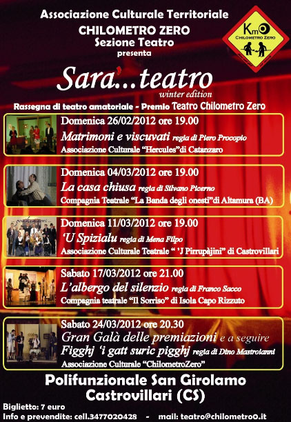 IL TEATRO AMATORIALE HA UNA RASSEGNA. PARTE DOMENICA LA RASSEGNA IDEATA E REALIZZATA DALL' ASSOCIAZIONE CULTURALE TERRITORIALE - KM0 -. COMUN DENOMINATORE IL RILANCIO DELLA TRADIZIONE E DEL DIALETTO " SARA'...TEATRO " WINTER EDITION - CINQUE SPETTACOLI IN DUE MESI. TUTTE COMPAGNIE DEL SUD ITALIA CON LA PASSIONE PER IL TEATRO MA A CARATTERE AMATORIALE. CON UN UNICO COMUN DENOMINATORE: VOLER DIFFONDERE LE TRADIZIONI DEL MERIDIONE E VALORIZZARE IL PATRIMONIO LINGUISTICO. DA QUI È NATA L’IDEA DI “KM0” ASSOCIAZIONE CULTURALE TERRITORIALE - NATA A SARACENA 3 ANNI FA - , PRESIEDUTA DA LEO FORTE, DI DEDICARE UNA RASSEGNA ESCLUSIVAMENTE AL RILANCIO DELLE TRADIZIONI DEL SUD CON UNA ATTENZIONE PARTICOLARE ALLA COMMEDIA BRILLANTE IN VERNACOLO. “SARÀ...TEATRO" WINTER EDITION” PARTIRÀ DOMENICA 26 FEBBRAIO DAL POLIFUNZIONALE DI SAN GIROLAMO, A CASTROVILLARI, CHE DIVENTERÀ, FINO AL 24 MARZO PROSSIMO (DATA DI CHIUSURA DELLA RASSEGNA), IL QUARTIER GENERALE DEL TEATRO AMATORIALE CALABRESE. RESPONSABILE DELLA RASSEGNA È DINO MASTROIANNI, CHE DIRIGE LA SEZIONE TEATRO DEL SODALIZIO GIOVANILE NATO NEGLI SCORSI ANNI SUL TERRITORIO, CHE A NOME DELL’ASSOCIAZIONE CULTURALE TERRITORIALE “KM0” HA SCOVATO LE CINQUE COMPAGNIE CHE PRENDERANNO PARTE AL CARTELLONE DELLA RASSEGNA E SI METTERANNO IN “GIOCO” OLTRE CHE PER FAR DIVERTIRE IL PUBBLICO, ANCHE PER CONTENDERSI LA PRIMA EDIZIONE DEL “PREMIO TEATRO CHILOMETRO ZERO” CHE VERRÀ ASSEGNATO AL TERMINE DELL’EVENTO. UNA RASSEGNA CON PREZZI POPOLARI (OGNI SPETTACOLO COSTERÀ SOLO 7€) E CHE NON GODE DEL SOSTEGNO DI NESSUN ENTE, MA VIVE DELLA PASSIONE E DELL’IMPEGNO DI QUANTI L’HANNO PENSATA E REALIZZATA. TEATRO AMATORIALE SI, MA DI OTTIMA QUALITÀ, CON LA SELEZIONE AVVENUTA TRA LE COMPAGNIE CHE DA TEMPO, NEI LORO CONTESTI DI RIFERIMENTO, SONO CONOSCIUTE ED APPREZZATE DAL PUBBLICO. SI PARTE DOMENICA 26 FEBBRAIO ALLE ORE 19.00 CON “MATRIMONI E VISCUVATI” DELL’ASSOCIAZIONE CULTURALE “HERCULES” DI CATANZARO PER LA REGIA DI PIERO PROCOPIO. POI IL 4 MARZO SARÀ LA VOLTA DELLA COMPAGNIA TEATRALE “LA BANDA DEGLI ONESTI” DI ALTAMURA (BA) CON “LA CASA CHIUSA” PER LA REGIA DI SILVANO PICERNO; L’11 MARZO L’ASSOCIAZIONE CULTURALE TEATRALE “J PIRRUPÀJINI” DI CASTROVILLARI PORTA IN SCENA “U SPIZIALU” PER LA REGIA DI MENA FILPO; “L’ALBERGO DEL SILENZIO” PER LA REGIA DI FRANCO SACCO SARÀ LA PROPOSTA PER IL 17 MARZO A CURA DELLA COMPAGNIA TEATRALE “IL SORRISO” DI ISOLA CAPO RIZZUTO. CONCLUDERÀ LA RASSEGNA SABATO 24 MARZO L’ASSOCIAZIONE CULTURALE “KM0” CON “FIGGHJ ‘I GATT SURIC PIGGHJ” PER LA REGIA DI DINO MASTROIANNI (UNICO SPETTACOLO A NON ESSERE IN LIZZA PER IL PREMIO), PRECEDUTO DAL “GRAN GALÀ DELLE PREMIAZIONI”. CINQUE I PREMI DA ASSEGNARE DURANTE LA SERATA CONCLUSIVA: QUELLO PER IL MIGLIOR SPETTACOLO, MIGLIOR ATTORE E MIGLIORE ATTRICE, MIGLIOR SCENOGRAFIA E IL PREMIO DELLA REGIA. PER INFO E PRENOTAZIONI SONO DISPONIBILI IL NUMERO TELEFONICO 347.7020428 E LA MAIL TEATRO@CHILOMETRO0.IT. TRE I PUNTI PREVENDITA UFFICIALI DELLA RASSEGNA: A SARACENA LA TABACCHERIA DE BERNARDI E IL SUPERMERCATO VERDEBLÙ, MENTRE A CASTROVILLARI LA TABACCHERIA - RICEVITORIA TABACCHI E FORTUNA. |