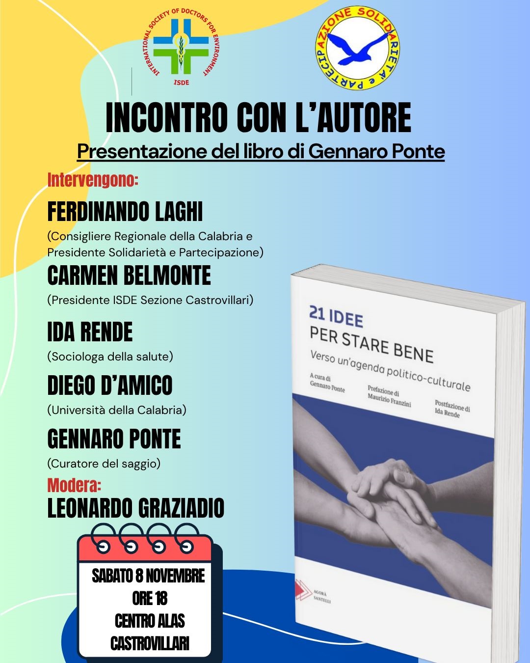 L' 8 Novembre a Castrovillari la presentazione del saggio " 21 Idee per stare bene " di Gennaro Ponte - Si svolgera' sabato 8 novembre alle ore 18 presso il Centro Alas di Castrovillari la presentazione del libro " 21 Idee per stare bene " di Gennaro Ponte. L’evento rientra nell’iniziativa culturale “Incontro con l’Autore”, promossa dalle associazioni “Solidarietà e Partecipazione” Castrovillari e Isde Italia Medici per l’Ambiente Sezione di Castrovillari. Nel dialogo con l’autore verranno approfonditi i temi centrali dell’opera e il percorso creativo e umano dell'autore che lo ha portato alla sua realizzazione. Il saggio "21 idee per star bene", edito da Santelli, presenta una agenda politico-culturale volta a gettare semi di riflessione alla classe politica del domani e non solo, “a cui sembra voler indicare una strada: ritornare alla comunità”. Politica, Cultura e Sviluppo: sono le tre parole chiave che danno forma al volume e i perni intorno a cui si sviluppa questo progetto che vuole ripensare l’essere umano come persona capace di cambiare sé stessa per vivere nella collettività. Gennaro Ponte è attualmente Dottorando di ricerca in Teoria e Prassi del Diritto presso il Dipartimento di Scienza Aziendali e Giuridiche UniCal. Studia da anni le narrazioni, i diritti sociali e le istituzioni.