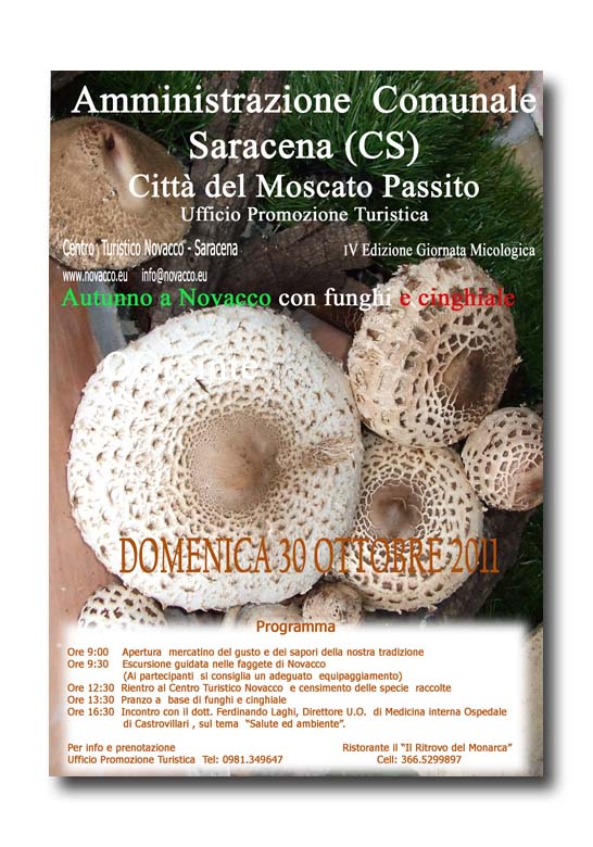 IL 30 OTTOBRE, L' AMMINISTRAZIONE COMUNALE HA ORGANIZZATO, PRESSO IL CENTRO TURISTICO NOVACCO, SECONDO UNO SPECIFICO PROGRAMMA, UNA GIORNATA MICOLOGICA CHE CONIUGA MOMENTI DI SVAGO, DI FASCINO E D’ APPRENDIMENTO. LA GIORNATA INIZIERÀ, NELLE PROSSIMITÀ DELLE STRUTTURE RICETTIVE, CON L’APERTURA DEGLI STAND DI PRODOTTI LOCALI E PROSEGUIRÀ CON L’ESCURSIONE NELLE FAGGETE PER LA RACCOLTA DEI FUNGHI. A GUIDARE GLI APPASSIONATI VI SARÀ UN ESPERTO DEL TERRITORIO CHE FAVORIRÀ L’IMMERSIONE NELLA NATURA DALLE TANTE TONALITÀ DI COLORI, TIPICHE DELLA STAGIONE, E DALLA VARIETÀ DI PROFUMI CHE CONQUISTANO L’OLFATTO . QUESTA È LA SORPRESA CHE GLI INTERESSATI TROVERANNO: UN BOSCO CHE SVELA LA PRESENZA DI ALBERI DI SPECIE DIVERSE PER LA VARIETÀ DEL COLORE E UN SUOLO CHE REGALA PRODOTTI NATURALI DI BUONA QUALITÀ. AL RIENTRO DALL’ESCURSIONE, IN ATTESA DEL PRANZO, SI POTRANNO CENSIRE LE SPECIE RACCOLTE E VIVERE INSIEME UNA SIGNIFICATIVA ESPERIENZA DI SOCIALIZZAZIONE. L’ EVENTO SARÀ CONCLUSO DAL DOTT. FERDINANDO LAGHI, DIRETTORE U.O. DI MEDICINA INTERNA DELL’OSPEDALE DI CASTROVILLARI , CHE INTERVERRÀ SUL TEMA “SALUTE ED AMBIENTE”. SINDACO MARIO ALBINO GAGLIARDI |