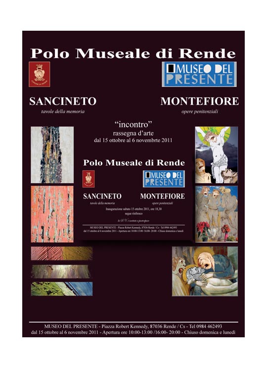 L' ARTISTA, EDITORE, MIMMO SANCINETO ESPONE LE SUE " TAVOLE DELLA MEMORIA " AL MUSEO DEL PRESENTE DI RENDE - " INCONTRO " E' IL TITOLO DELLA RASSEGNA D' ARTE CHE VERRA' INAUGURATA IL PROSSIMO 15 OTTOBRE E SINO AL 6 NOVEMBRE RIMARRA' ALLESTITA PRESSO IL POLO MUSEALE DI RENDE. L' INCONTRO ARTISTICO TRA DUE PITTORI, SANCINETO E MONTEFIORE CHE PROPONGONO IN CONTEMPORANEA I LORO PERCORSI PITTORICI, PROFONDAMENTE DIVERSI. IN VERITA' L' IDEA DELL' ACCOPPIATA ARTISTICA, STA PROPRIO NELL' EVIDENZIARE LA DIVARICAZIONE FILOSOFICA-COMPORTAMENTALE ESISTENTE TRA I DUE PITTORI CHE DESCRIVONO UN PERCORSO ESISTENZIALE PRATICAMENTE OPPOSTO, MA IN NATURA NON DI RADO GLI OPPOSTI SI COMPENSANO E DUNQUE IL VISITATORE RIMARRA' STUPITO DI QUANTA COMPLEMENTARITA' L' ESPOSIZIONE PROPONE, DA UN LATO LA PROFONDA INQUIETUDINE ESPRESSA DALLE AUDACI FIGURAZIONI DI MONTEFIORE NELLE SUE OPERE PENITENZIALI, DALL' ALTRA L' ARTE DI SANCINETO PIU' PACATA, A TRATTI MISTICA NEL SEGNO DELLA MEMORIA. LA MOSTRA SARA' PRESENTATA DA TONINO SICOLI, CRITICO D' ARTE E COORDINATORE DEL POLO MUSEALE DI RENDE. |