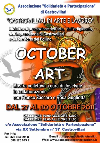 OCTOBER ART: COLLETTIVA DI ARTISTI CASTROVILLARESI dal 27, 28, 29 E 30 OTTOBRE (DALLE 10 ALLE 13 E DALLE 18 ALLE 21) PRESSO LA SEDE DELL' ASSOCIAZIONE " SOLIDARIETA' E PARTECIPAZIONE " |
