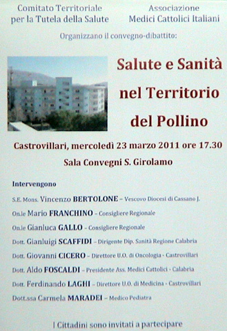 E' STATO PRESENTATO IL CONVEGNO-DIBATTITO: " SALUTE E SANITA' NEL TERRITORIO DEL POLLINO " CHE SI TERRA' A CASTROVILLARI MERCOLEDI' 23 MARZO 2011 ALLE ORE 17,30 PRESSO LA SALA CONVEGNI DI SAN GIROLAMO |