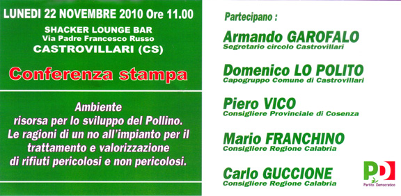 SI E' TENUTA A CASTROVILLARI LUNEDI' 22 NOVEMBRE, LA CONFERENZA STAMPA ORGANIZZATA DALLA LOCALE SEZIONE DEL PD SUL TEMA: " AMBIENTE, RISORSA PER LO SVILUPPO DEL POLLINO. LE RAGIONI DI UN NO ALL' IMPIANTO PER IL TRATTAMENTO E VALORIZZAZIONE DI RIFIUTI PERICOLOSI E NON PERICOLOSI ". PRESENTI ALL' INCONTRO ARMANDO GAROFALO SEGRETARIO DEL LOCALE CIRCOLO DI CASTROVILLARI, DOMENICO LO POLITO CAPOGRUPPO AL COMUNE DI CASTROVILLARI, PIERO VICO CONSIGLIERE PROVINCIALE, MARIO FRANCHINO E CARLO GUCCIONE CONSIGLIERI REGIONALI. NEL CORSO DELL' INCONTRO I RELATORI HANNO SCIORINATO LE LORO RAGIONI DEL NO A MEGASTRUTTURE CHE VADANO POI A SERVIRE NON SOLO IL TERRITORIO MA ANCHE TERRITORI LONTANI DAL COMPRENSORIO DEL POLLINO E DELLA SIBARITIDE. UNA CONTRARIETA' QUINDI NON PER DIRE NO A TUTTO COME E' STATO ESPLICITATO DAL CONSIGLIERE REGIONALE FRANCHINO, MA CONDIZIONATO AD UN UTILIZZO INTESO COME SERVIZIO PER IL TERRITORIO SU CUI POI VA AD INSISTERE UNA SIMILE STRUTTURA. IL CONSIGLIERE GUCCIONE NELL' ESPRIMERE LA PROPRIA OPINIONE SI E' INVECE RIFATTO AI NUMERI, ENTRANDO NELLO SPECIFICO DELLA CENTRALE DEL MERCURE DI CUI A SUO AVVISO IN TERMINI DI PRODUZIONE ENERGETICA LA CALABRIA NON HA BISOGNO VISTA L' ABBONDANZA DI ENERGIA ELETTRICA DI CUI IL TERRITORIO GODE. RIFERENDOSI ALL' ENEL HA QUINDI DETTO A CHIARE LETTERE CHE NON PUO' L'AZIENDA FARE E DISFARE A PROPRIO PIACIMENTO SU UN TERRITORIO A CUI CERTO NON MANCA LA VOCAZIONE AGRICOLA E TURISTICA ED A CUI UN AMBIENTE PER QUANTO POSSIBILE PULITO E SALUBRE NON PUO' CERTO FAR MALE. IN BREVE UN NO CONDIZIONATO QUELLO DEL PD CALABRESE ALLA REALIZZAZIONE DEL TERMOVALORIZZATORE E CHE COMUNQUE VA PENSATO IN ALTRA SEDE VISTO CHE LA SUA REALIZZAZIONE DOVREBBE ATTUARSI IN UN' AREA CHE NOTORIAMENTE E' UN DISTRETTO AGROALIMENTARE DI QUALITA'. DAL PUBBLICO SONO VENUTI GLI INTERVENTI DELLA SIGNORA BONADIES, CHE IN QUALITA' DI MILITANTE HA VOLUTO PORRE L' ATTENZIONE SULLE LINEE POLITICHE DEL PARTITO SPESSO TROPPO LONTANE DALLE ESIGENZE DELLE PERSONE NEL CAMPO LAVORATIVO E NON SOLO, POLITICHE CHE HANNO LASCIATO SI PERDESSERO TANTI, TROPPI POSTI DI LAVORO SUL TERRITORIO ( INTECA ) CHE RISCHIANO DI DEPAUPERARE LA GIA' DISASTRATA SANITA' E CHE NON SI OCCUPANO DEL SOCIALE ANCHE QUANDO SI E' PARTE DI POTERE. SEMPRE DAL PUBBLICO HA FATTO IL SUO INTERVENTO IL CONSIGLIERE AMBIENTALISTA DEL COMUNE DI CASTROVILLARI FERDINANDO LAGHI, SCONTATO PER CHI CONOSCE IL SUO CREDO POLITICO L' INTERVENTO CHE HA CONFERMATO IL NO ALLA REALIZZAZIONE DEL GASSIFICATORE IN CONTRADA CAMMARATA. SEGUE IL VIDEO INTEGRALE DELLA CONFERENZA